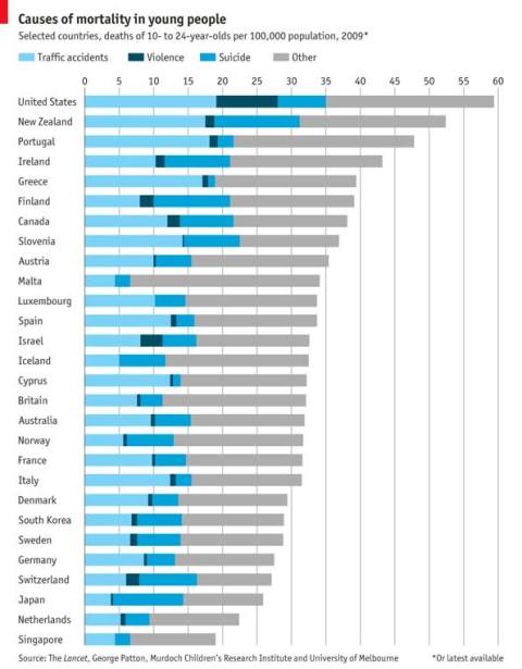 [2] Nella fascia di età tra i quindici ed i ventiquattro anni, il suicidio è, in Italia, la seconda causa di morte dopo gli incidenti automobilistici, negli Stati Uniti la prima.